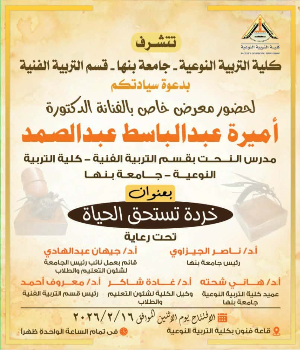 يُنظّم قسم التربية الفنية بـكلية التربية النوعية – جامعة بنها، يوم الاثنين الموافق 16/2/2026، معرضًا فنيًا مميزًا بعنوان «خُردة تستحق الحياة»، وذلك بقاعة فنون بالكلية في تمام الساعة الواحدة ظهرًا.