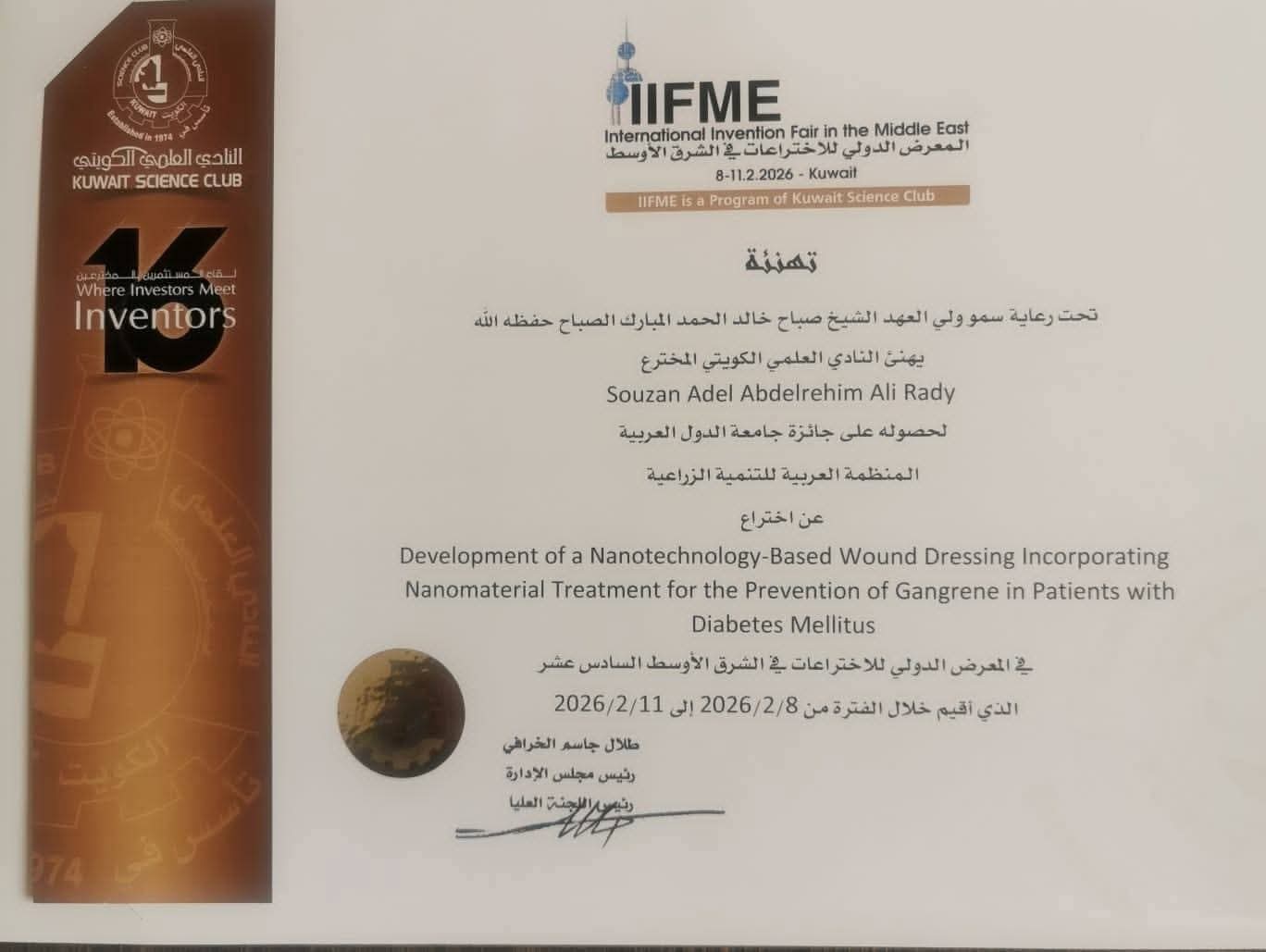 ووجه رئيس الجامعة التهنئة للدكتورة سوزان عادل عبد الرحيم، الأستاذ بكلية التربية النوعية بالجامعة لحصولها على الميدالية الذهبية مع مرتبة الشرف، إضافة إلى جائزة المنظمة العربية للتنمية الزراعية، عن ابتكار ضمادة طبية ذكية بتقنية النانو لعلاج جروح مرضى السكري والوقاية من الغرغرينا بتكلفة منخفضة.